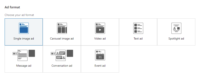 Kuvassa näkyy erilaisia LinkedInin mainosmuotojen vaihtoehtoja.